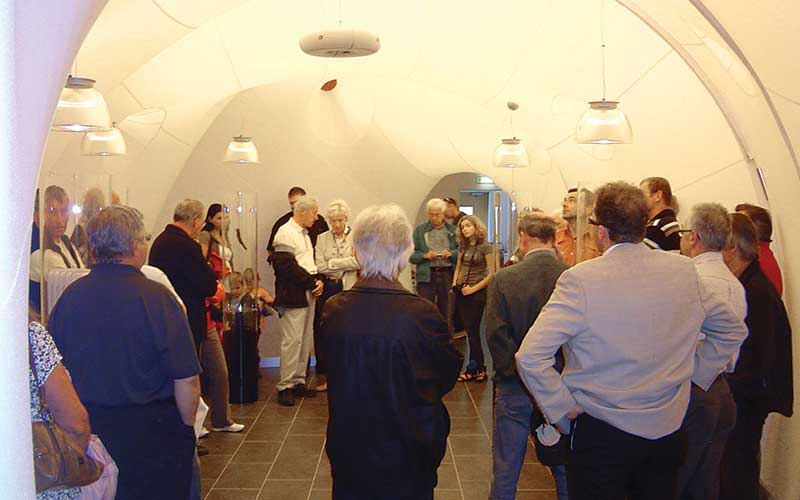 Diese Stimmung wird durch Ausstellungsgegenstände, optische Bespielung und akustische Beschallung verstärkt.