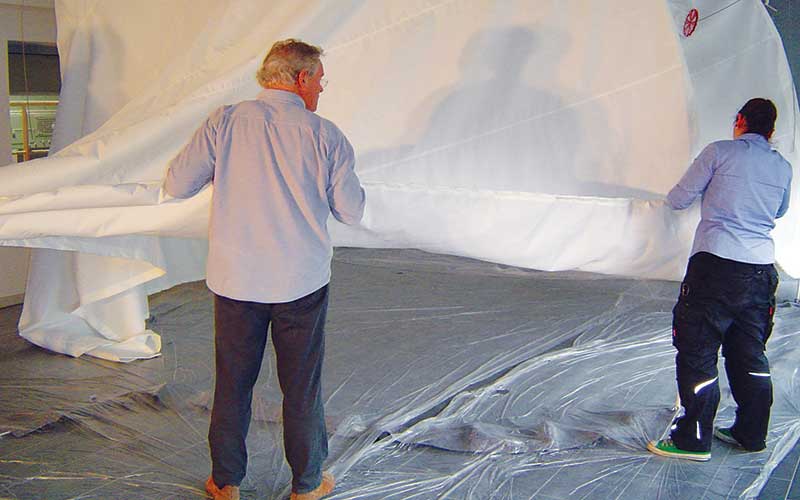 Die Membran wird an die boden- und deckenseitigen Abspannpunkte angeschlossen und gleichmäßig vorgespannt. So ist es möglich, dass sich eine faltenfreie und stabile Hülle aufspannen lässt.