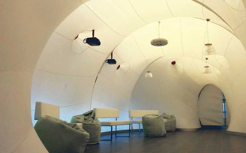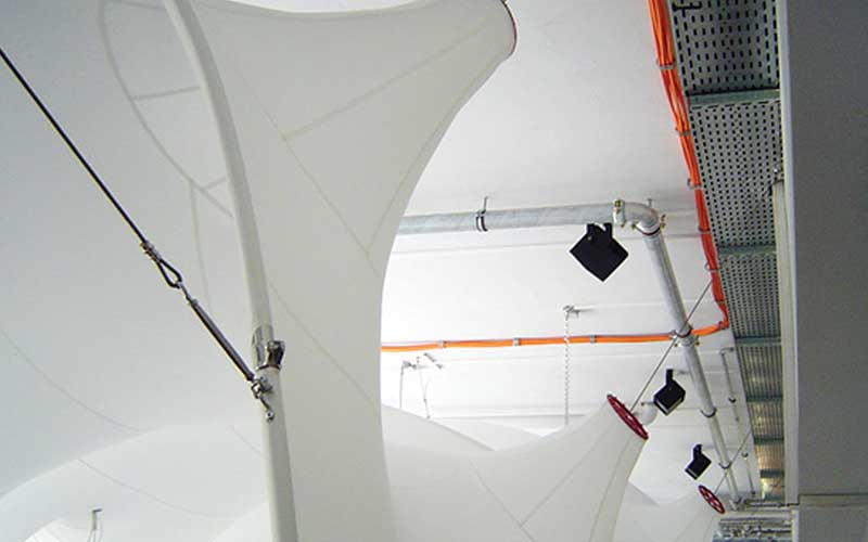 Die Raumhülle besteht aus einem textilen Gewebe, das durch Vorspannung in eine stabile Form gebracht wird.