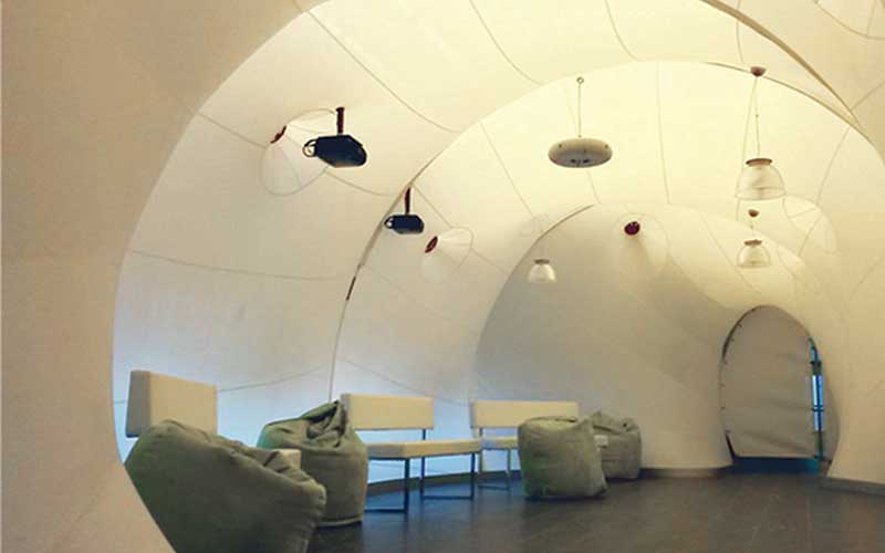 In der textilen Bubble werden mit Videoprojektionen Vorführungen zum Thema Abfall gezeigt.